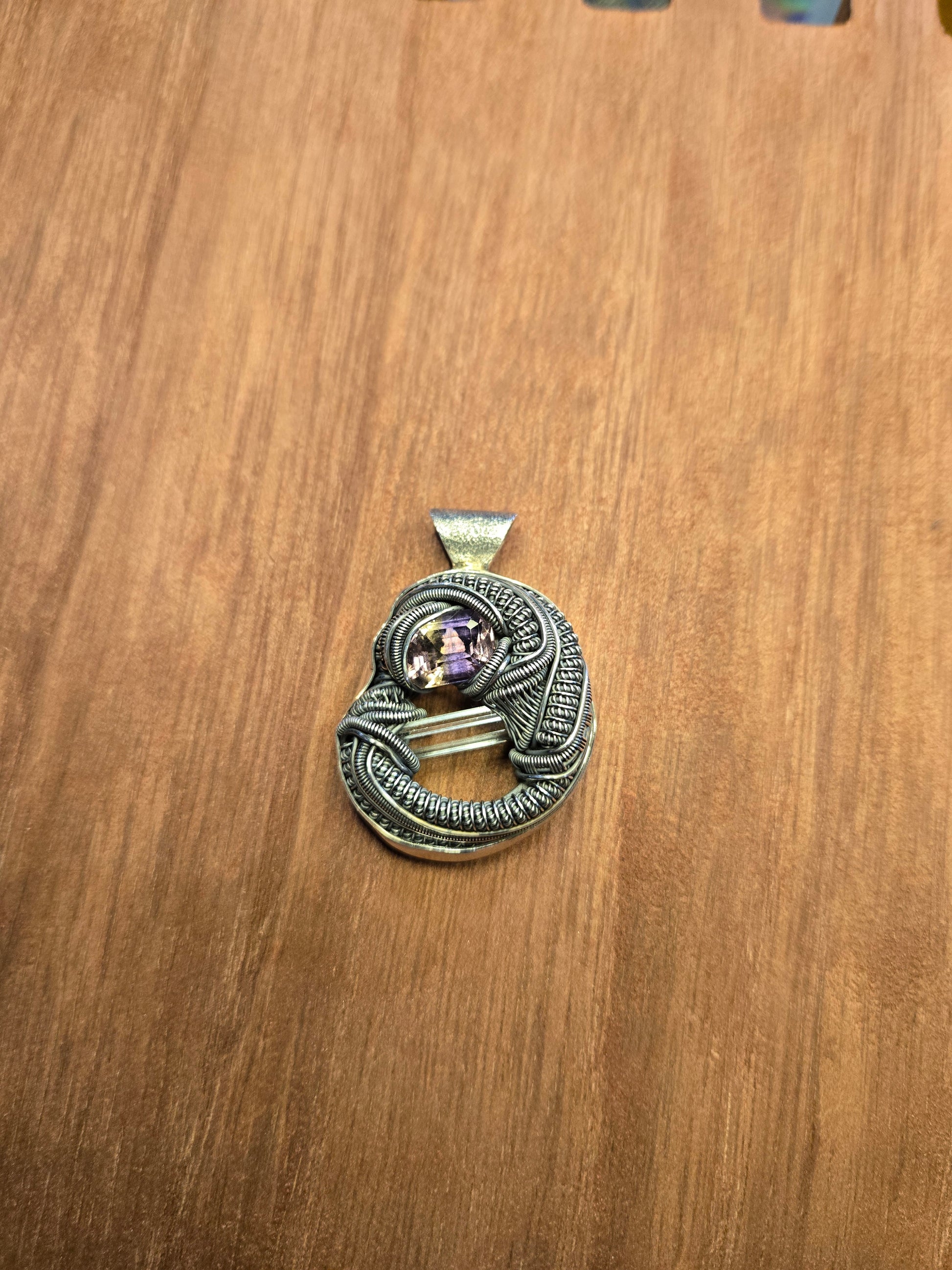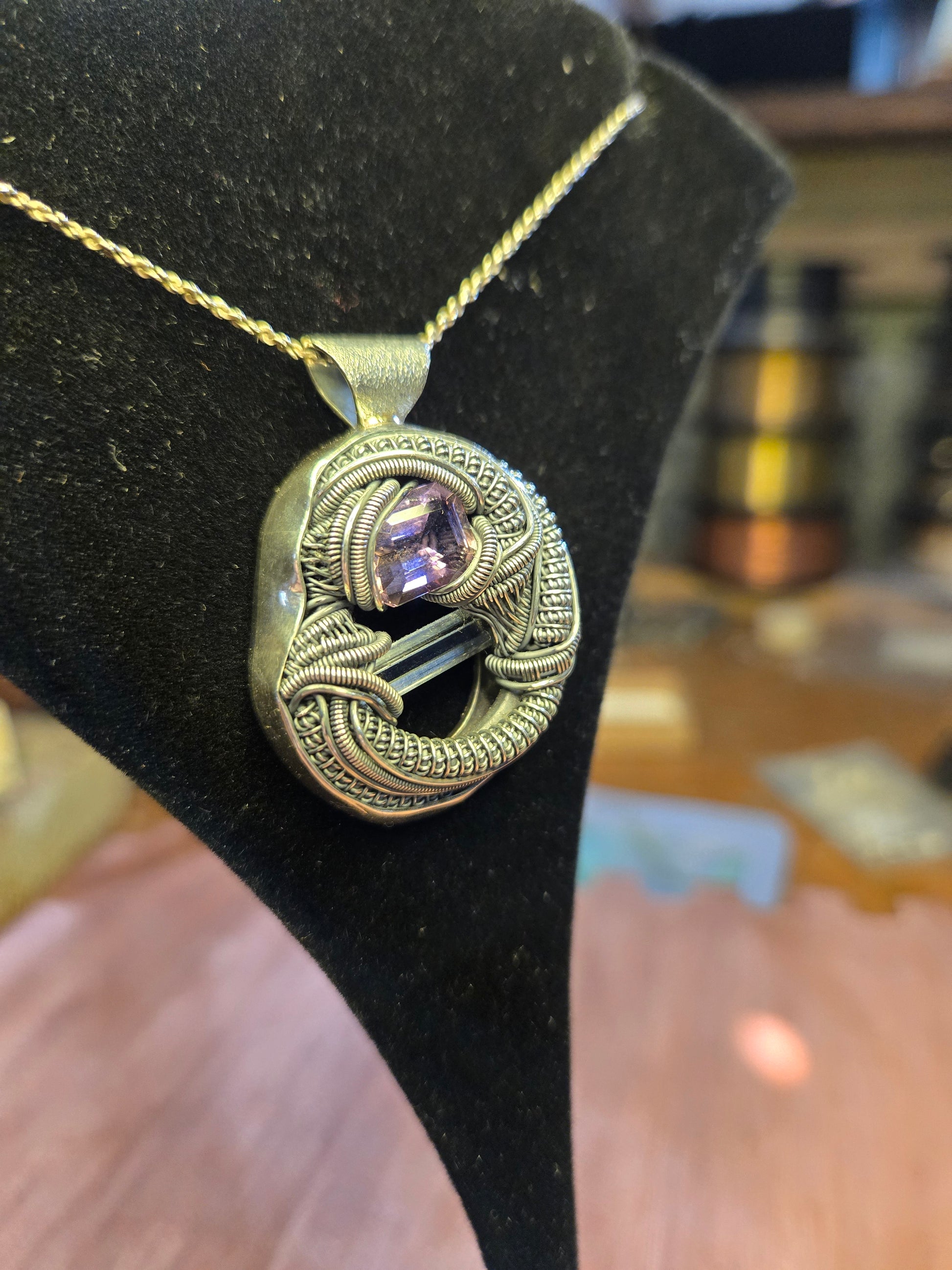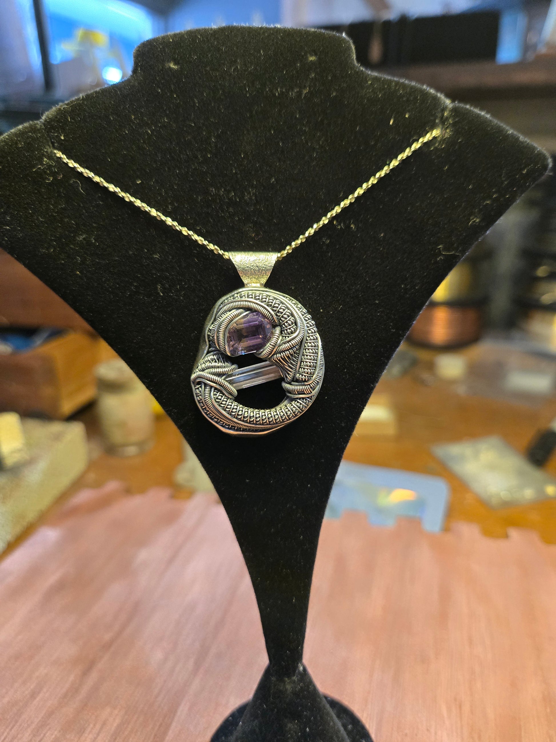This was made using solid sterling silver and sterling wire. It comes with a sterling silver chain.