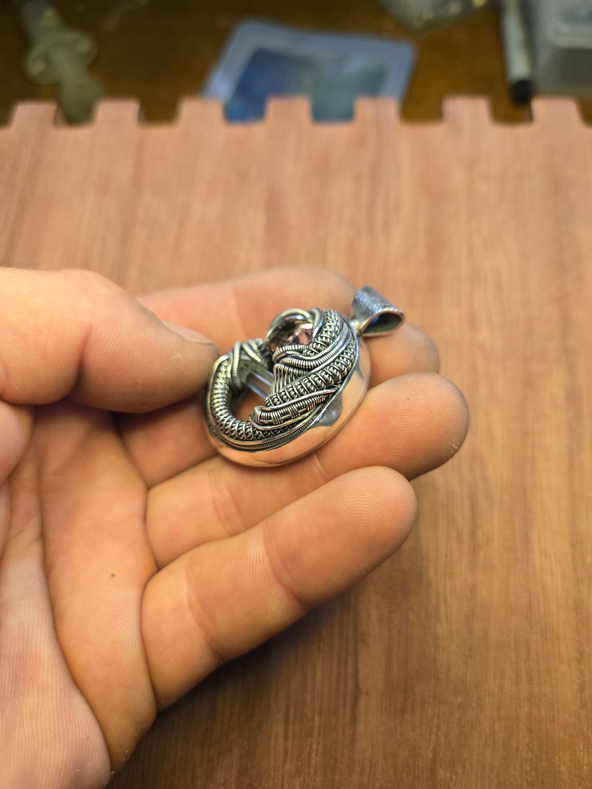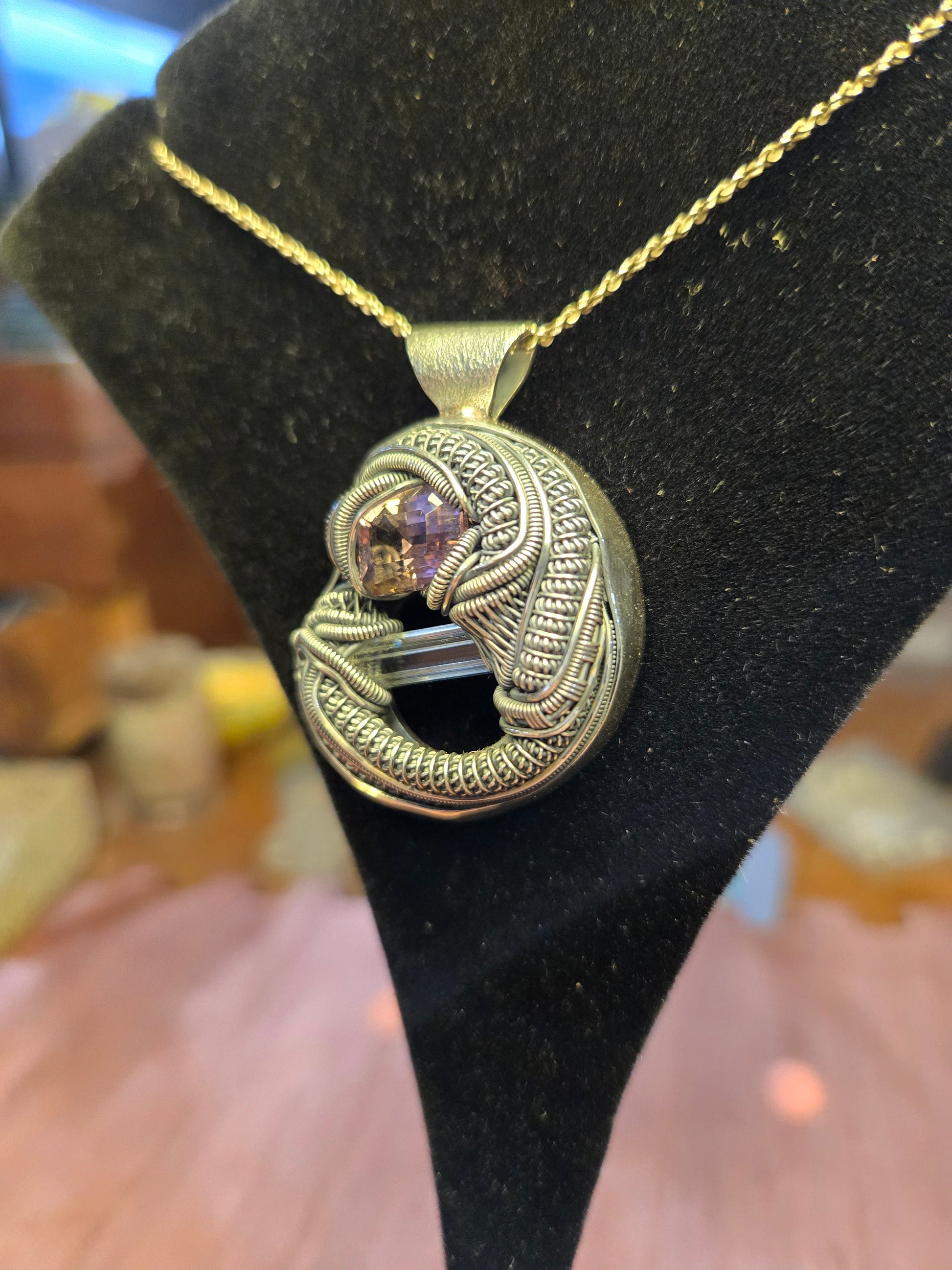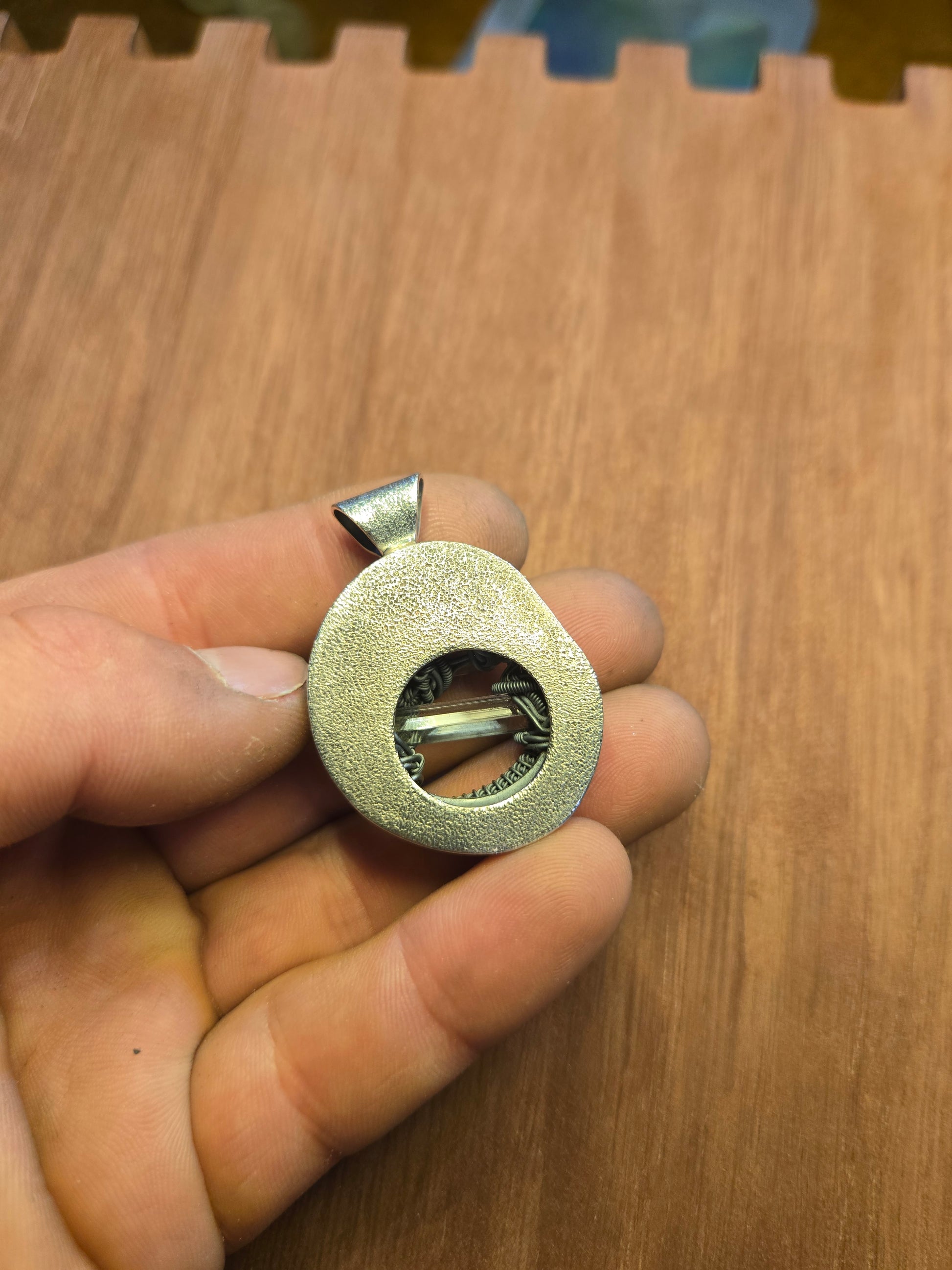 This was made using solid sterling silver and sterling wire. It comes with a sterling silver chain.