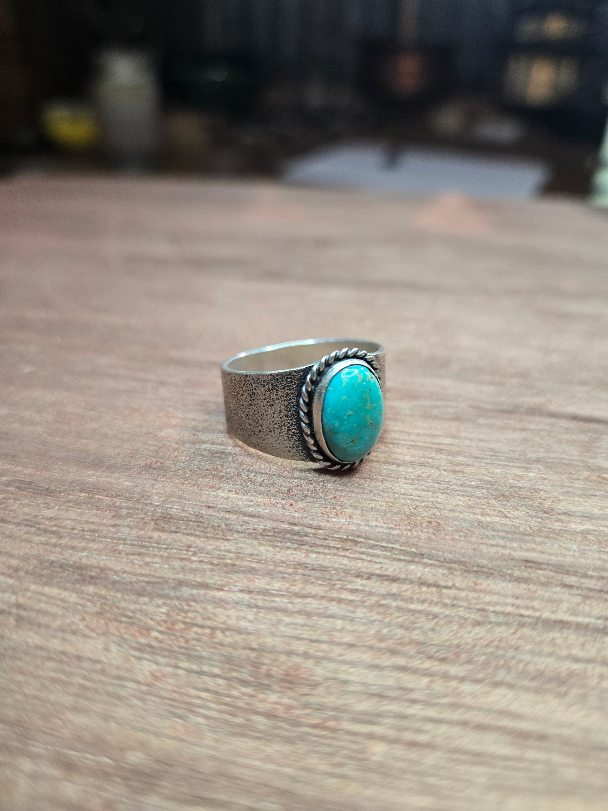 A beautiful piece of turquoise set in sterling silver with braided silver wire to add a stylish flair. It also has a textured design that give a classy yet old fashioned design.
